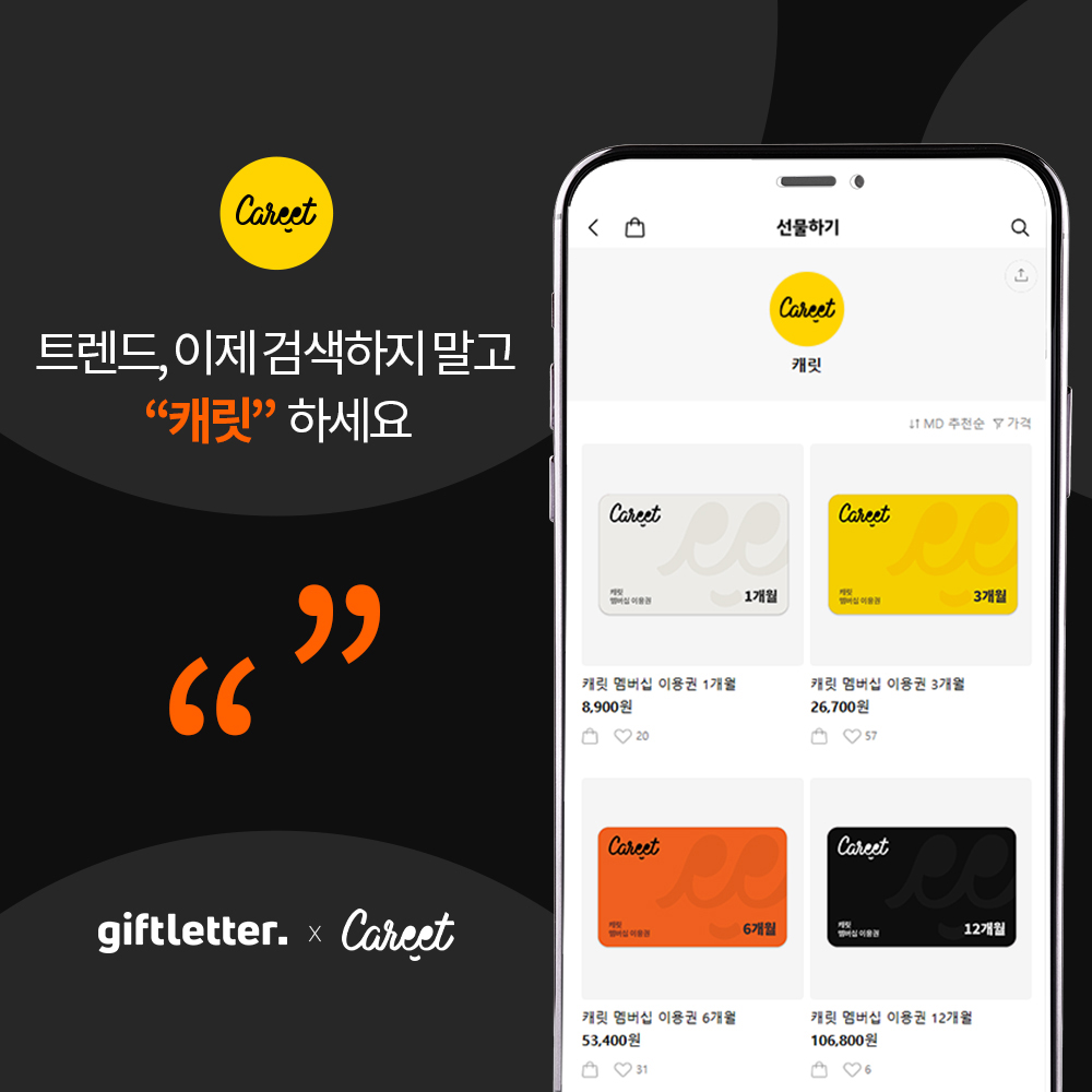 Z세대 트렌드 분석 미디어 플랫폼 '캐릿(Careet)'의 구독형 모바일 상품권을 출시했다고 기프트레터가 8일 밝혔다.
